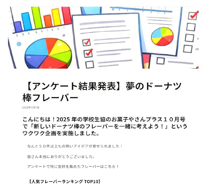 業務課 お知らせ オリジナルドーナツ棒 アンケート結果 2026年2月9日2026年2月9日 サイト編集者2 ◎新潟県学校生協の組合員さんから、大変多くの回答をいただきました。 ご協力いただきありがとうございました。